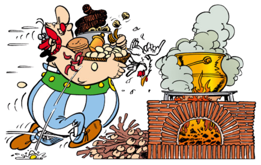 Heureusement, pour les lendemains de soirées difficiles, l’invraisemblable potion préparée par Astérix et Obélix vaut tous les remèdes de grand mères : de la confiture, du poivre, du sel, des rognons, des figues, du savon de Massilia, une poule (non plumée), du miel, du piment, du boudin, des œufs et des pépins de grenade… Miam !